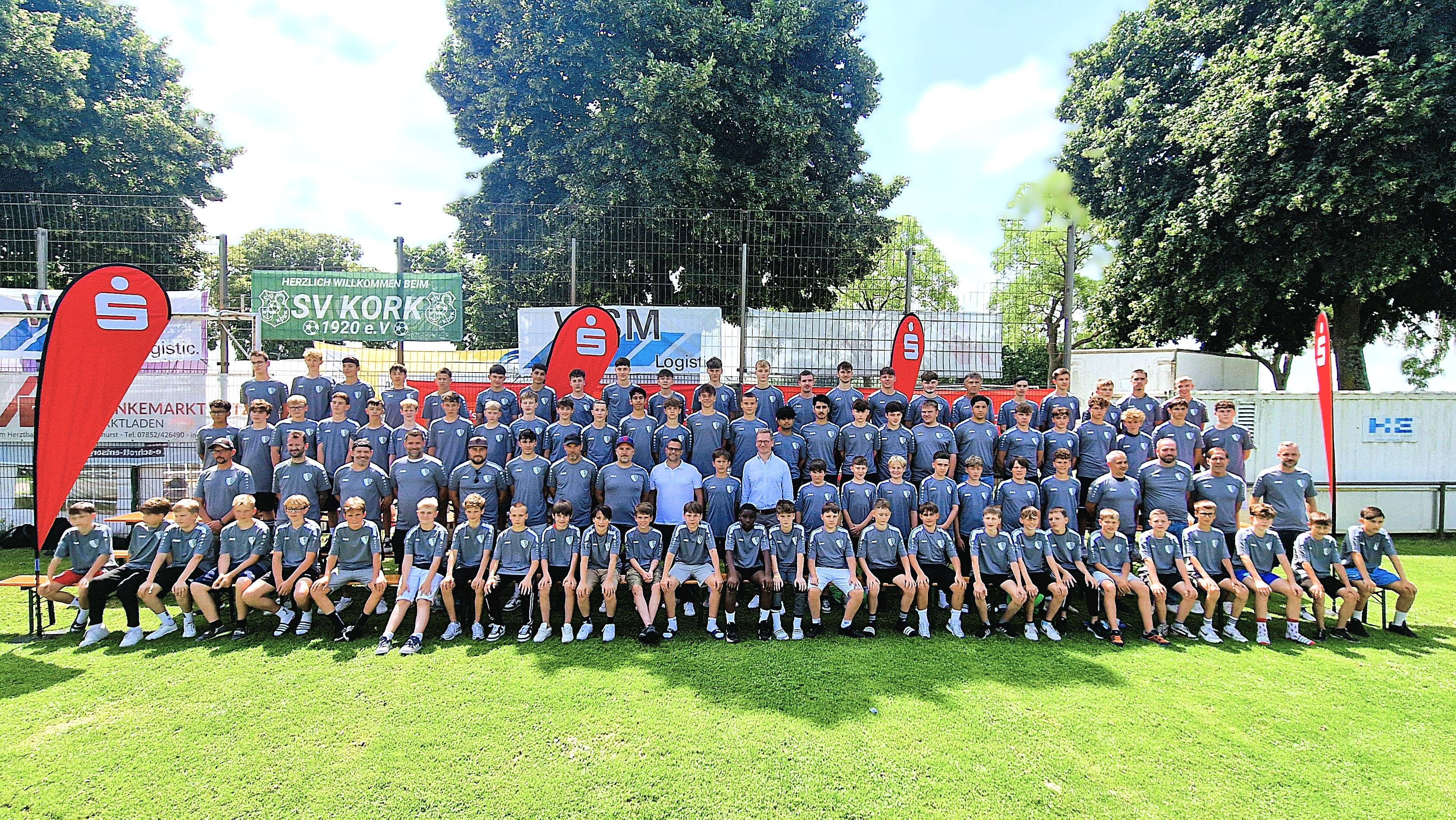 Willstätt (ho). Am vergangenen Samstag waren alle Jugendspieler der JFSG Gemeinde Willstätt und SV Kork zur offiziellen Saisoneröffnung in Kork eingeladen. Im Rahmen des Sportfestes des SV Kork erhielt jeder der mittlerweile über 130 Jugendspieler ein T-Shirt der JFSG, das von der Sparkasse Hanauerland gesponsert wurde. Anschließend wurde ein großes Gruppenfoto gemacht. Mit dabei waren Wolfgang Huber, Vorsitzender des Vorstands der Sparkasse Hanauerland, und Dominik Lentz, Abteilungsdirektor des Geschäftsbereichs Vertriebsmanagement und Treasury der Sparkasse Hanauerland. „Es ist uns ein Herzensanliegen, mit dieser Spende das Ehrenamt und die Jugendarbeit in unserer Region zu fördern, denn hier wachsen nicht nur Talente, sondern auch Teamgeist, Respekt und Zusammenhalt. Sport verbindet, stärkt die Gemeinschaft und bietet gerade jungen Menschen mit unterschiedlichsten Hintergründen eine wertvolle Perspektive.“ So Wolfgang Huber. Nach einer kurzen Ansprache der Verantwortlichen und einigen Informationen zu den Abläufen in der neuen Saison gab es für alle Jugendspieler, Trainer und Betreuer noch etwas zu essen und zu trinken. In legerer Atmosphäre konnte man sich gemeinsam auf die neue Saison einstimmen. Die Jugendmannschaften der JFSG befinden sich bereits in der ersten Phase der Saisonvorbereitung. Nach einer kurzen Sommerpause in den Ferien steigen die Teams dann nach und nach in die zweite Vorbereitungsphase ein.