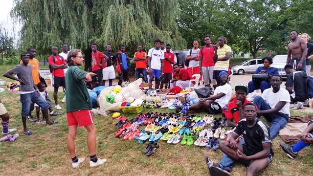 Letztlich konnten wir einer talentierten Fußballmannschaft, bestehend aus Flüchtlingen, viele hiervon aus Gambia, persönlich und stellvertretend, Georg Imgraben und Lutz Schenk von der Initiative „Zuflucht Mülheim e.V.“, 47 Paar Fußballschuhe, 39 Paar Turnschuhe, ca. 100 Trikots, Hosen, Stutzen und 65 Bälle, überreichen.