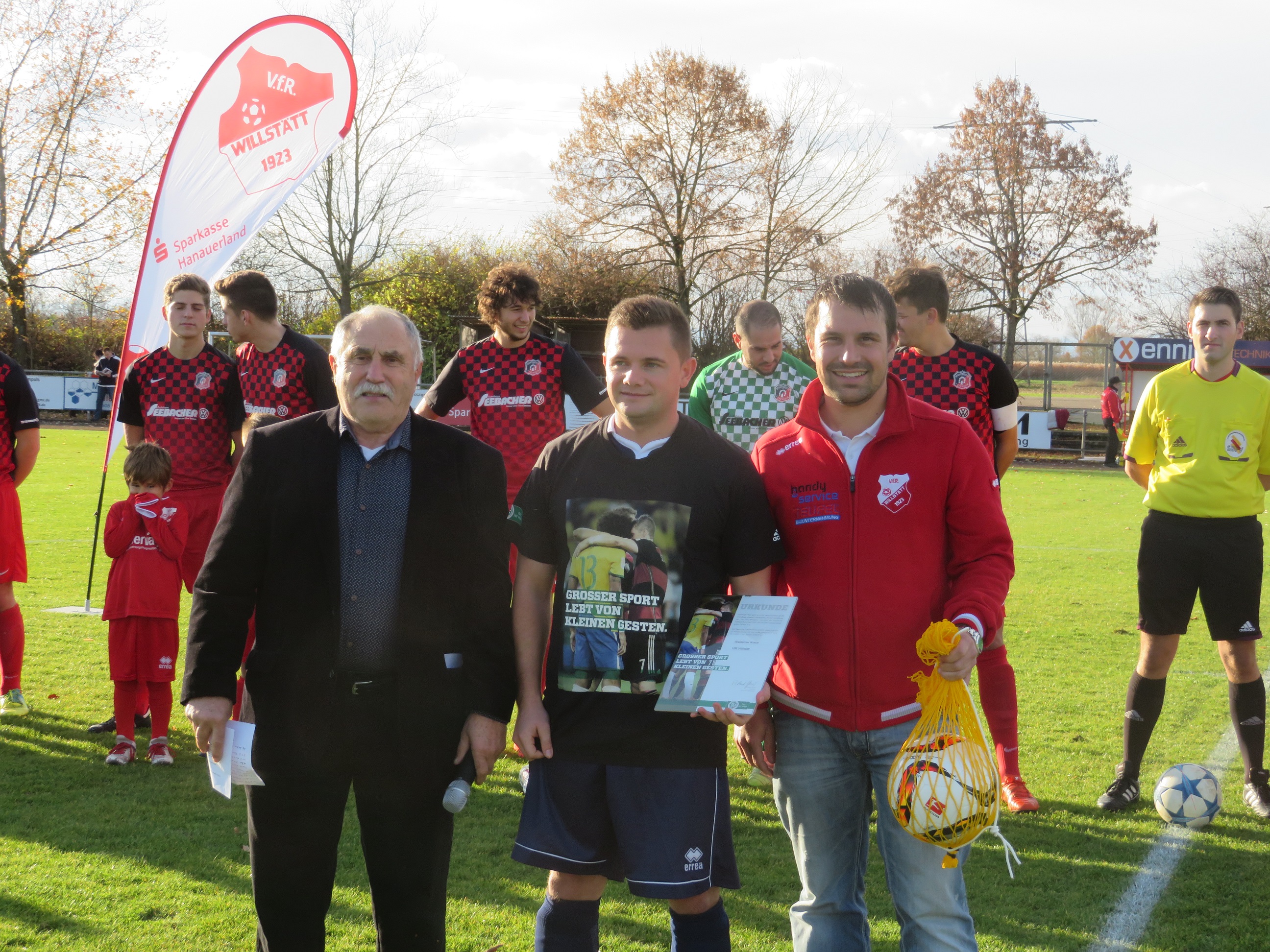 Manfred Müller überreichte Waldemar Kraus vor der Begegnung ein T-Shirt und eine Urkunde mit der Aufschrift des DFB-Fair-Play Slogan „Grosser Sport lebt von kleinen Gesten“, abgebildet sind Bastian Schweinsteiger und Thomas Müller die den Brasilianer Dante nach dem 7:1 Sieg des DFB im WM-Halbfinale in den Armen halten. Des Weiteren erhielt Kraus einen Gutschein für den DFB Fanshop und VfR Vorsitzender Stefan Hochwald bekam einen Spielball von Manfred Müller überreicht.